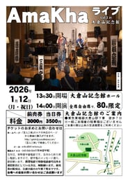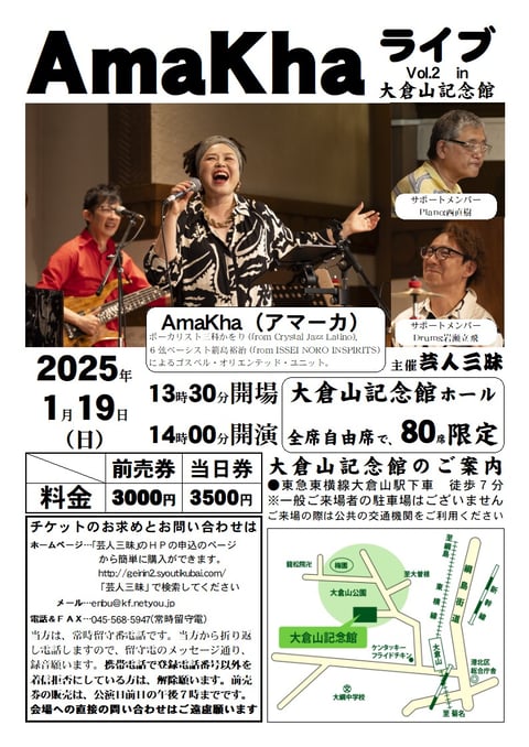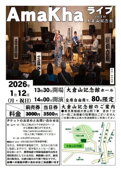 2025年最初のAmaKhaライブは2回目の出演となる大倉山記念館のホールで行われます。私,個人的に横浜市港北区とは浅からぬ縁がありまして,通っていた大学が日吉にあったのと20代の頃8年ほど妙蓮寺に住んでいたことがあります。そのため最初の機材車を買った頃の移動範囲はまさに港北区あたりが中心で,今でも綱島街道を車で通ると96〜03年辺りのいろいろな思い出が蘇ってきます。