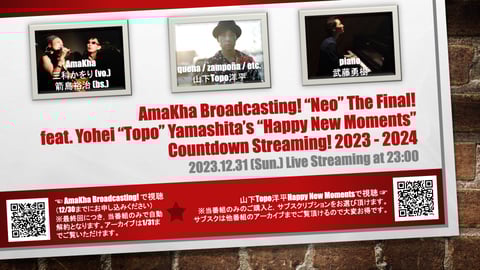 AmaKha Broadcasting! (ABC) 最終回年越し配信,ご視聴ありがとうございました! 恒例のどん兵衛実食からAmaKha曲&Topo曲演奏,カウントダウン儀式に2024風船に楽しいトークと,最終回にふさわしい盛り上がりを以て無事配信を終えることができました。サブスクご契約者の皆様,長きにわたるご愛顧本当にありがとうございました。12/30にお送りしているメールに記載されている「アーカイブ掲載URL」にアクセスしていただけますと配信のアーカイブがご覧いただけますので是非ご利用くださいませ(1/31まで)。もし「URLが判らなくなった!」とかありましたらお手数ですがメールフォームよりご連絡ください。また「ABCは契約していなかったけど最終回見たかった」という方は山下Topo洋平君のチャンネルからアーカイブを見ることも可能(有料)ですのでこちらよりアクセスしてお手続きください。
