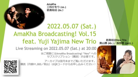 またサービスの内容的には,今後は基本的に佐久間優子 (pn.) さんをサポートミュージシャンとしてお迎えし,三人でのアンサンブルを中心にお楽しみいただくことになります。ただし月によっては,今年4月の4tuneとのコラボのように突然全く違ったメンバー/編成でお送りする回もあると思います。引き続き,AmaKha Broadcasting!をどうぞよろしくお願いいたします。