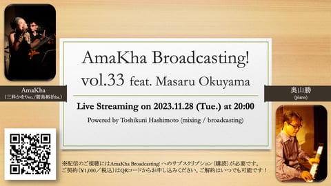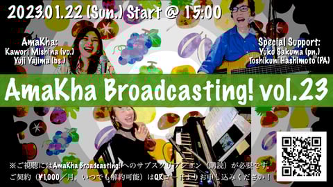 2021年3月以来2年8ヶ月にわたってお届けしてきましたサブスク制配信ライブ「AmaKha Broadcasting!」ですが,本年(2023年)12月度を持ちましてサービスを終了させていただく運びとなりました。