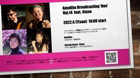 AmaKhaを初期の頃から知っておられる方の中にはア・カペラ・グループ「4tune(フォーチュン)」をご存知の方も多います。AmaKha三科女史もメンバーの一人である4tuneはAmaKhaより9年も前の2002年に結成されたユニットで,ライブを打てばチケットはすぐに売り切れてしまうという人気グループでもありますが,コロナ禍以降はAmaKhaと同じくライブハウスでの活動はほぼ休止し,リモートワークでの動画を精力的に発表しておられるようです。当初はオーソドックスなオーヴァーダビングによる動画を主に作っておられましたが,最近になって三科以外のお二人もSYNCROOMを始められたようで,殊にリハーサルの便利さには二人とも大層驚かれたらしく「もっと早くやっておけばよかった〜」という嘆息が漏れたとか漏れないとか(笑)。で,折角SYNCROOMが使えるようになったのであればこれはもうAmaKha Broadcastingへのゲスト出演をお願いするしかないでしょ…ということで,4月のABCではついに「AmaKha feat. 4tune」が実現することとなりました! 日程は4/17(日),いつもより少し遅い19時開演となります。