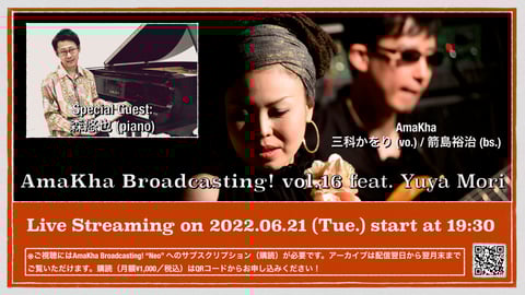 6月のAmaKha Broadcasting!は,箭島がインストバンド「Project QuO」で共演しているピアニストの森悠也君をゲストにお迎えしてお送りします! 森君はピアニストとしての活躍もさることながら作曲家としてすでに業界で不動の地位を築いており,近年ではNHK時代劇「わげもん」の音楽を手がけるなど,純粋なプレイヤー稼業の多い私の仲間内では特異な存在感を放つピアニストです。その演奏も鮮やかな個性にあふれており,一度AmaKhaのファンの方々に聴いていただきたいなと思っておりましたが今回そのまたとない機会が訪れた,というわけです。