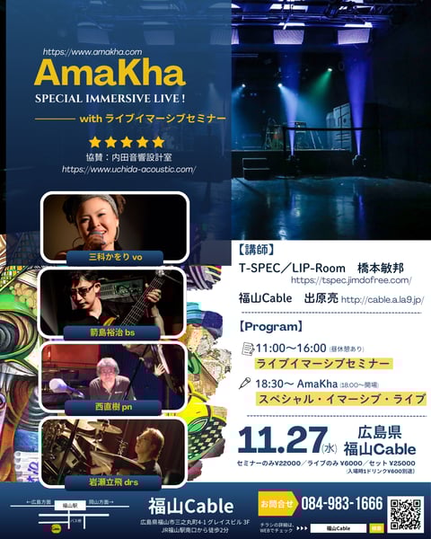 1ヶ月ほど前からサイドバーでプレ情報を出していましたが,11/27(水)に福山のライブハウス・Cable(ケーブル)さんで行われるAmaKhaスペシャルライブの概要が遂にリリースされました。国内のライブハウスでは唯一,Cableさんだけがそのシステムを擁する最先端の立体音響「ライブイマーシブ」をフィーチャーしたスペシャルライブとなります! さらに同日,主に音響関係者の皆様を対象とした「ライブイマーシブセミナー」も開催され,このセミナーの中でも私たちAmaKhaとサポートメンバーが個別に演奏し,最後に1曲実演して従来の2スピーカーPAとイマーシブの音響の差を体感していただくというコーナーがあるそうです。何それ超面白そう。ご予約はこちら!